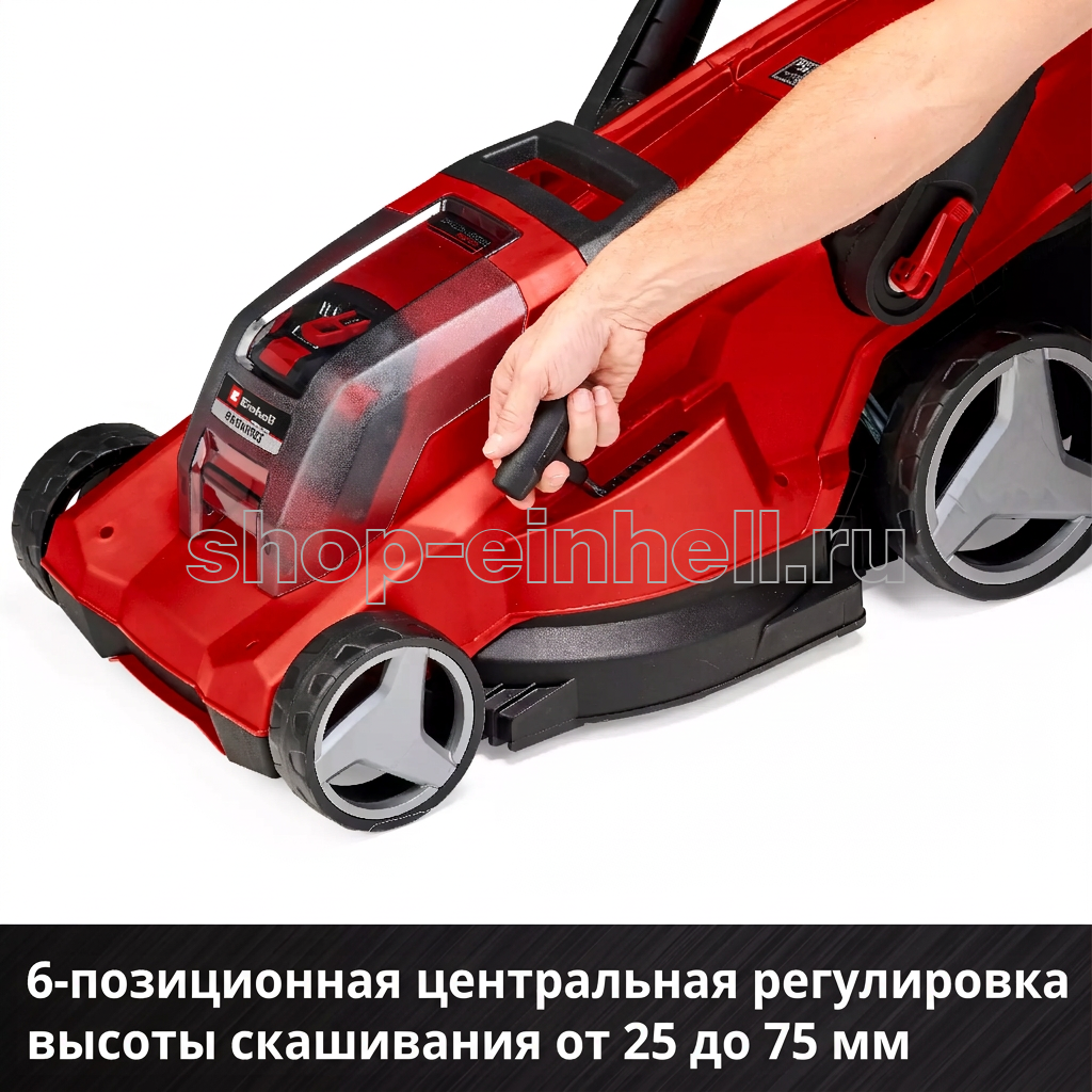 - 6-ступенчатая центральная регулировка высоты среза (25–75 мм)