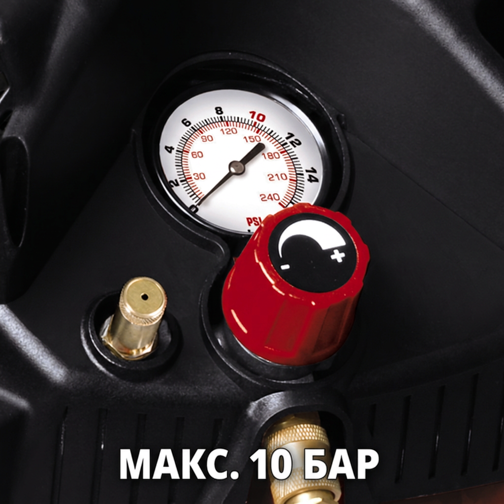 TC-AC 240/50/10 OF — это универсальный компрессор компактной, малогабаритной конструкции, без которого не может обойтись ни одна мастерская или гараж. Он оснащен регулятором давления, с помощью которого можно настраивать рабочее давление до 10 бар, а также является незаменимым помощником при выполнении самых разнообразных работ, требующих использования сжатого воздуха. Его двигатель работает без смазки, поэтому компрессор требует минимального обслуживания и может перемещаться в любом положении.