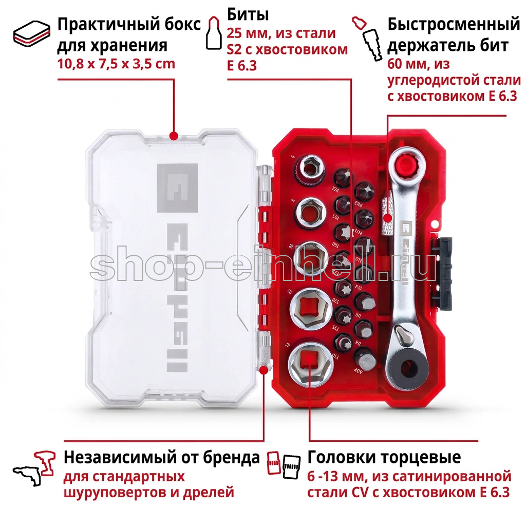 НАБОР БИТ И ГОЛОВОК EINHELL 21 ПРЕДМЕТ, БИТОДЕРЖАТЕЛЬ, КЛЮЧ РЕВЕРСИВНЫЙ, XS-CASE 118683