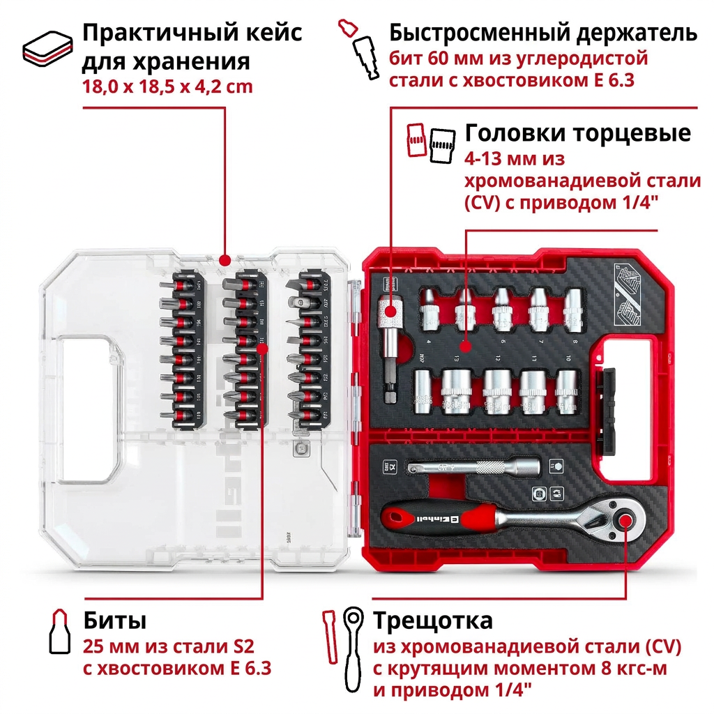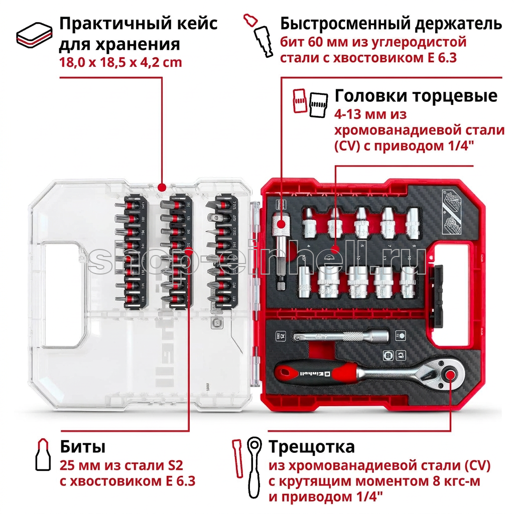 НАБОР БИТ И ГОЛОВОК EINHELL 37 ПРЕДМЕТОВ, БИТОДЕРЖАТЕЛЬ, КЛЮЧ РЕВЕРСИВНЫЙ, L-CASE 109022