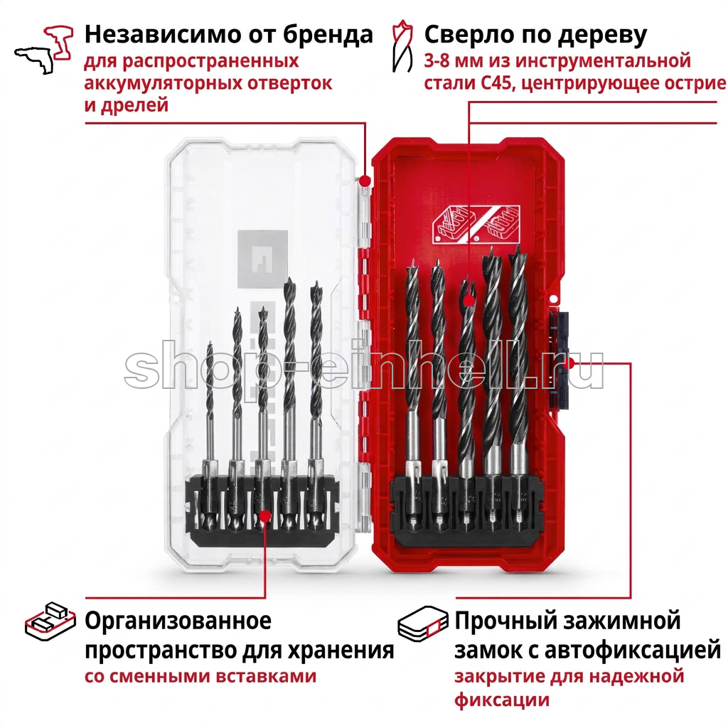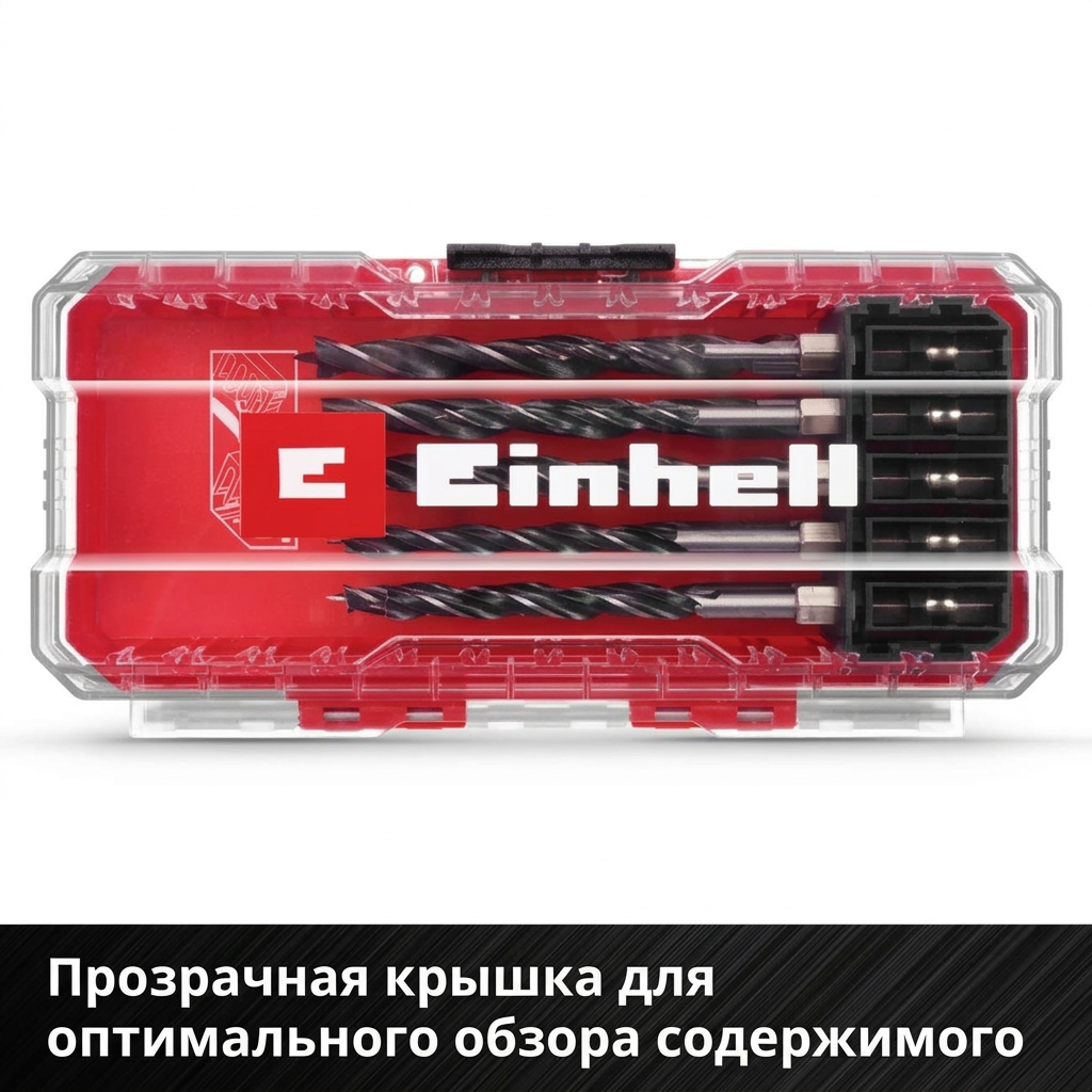 Точное сверление - трехточечная обработка с центрирующим наконечником в наборе сверл по дереву обеспечивает быстрое и точное сверление во всех породах древесины. Оптимизированное удаление стружки - двухспиральная форма правого режущего сверла по дереву обеспечивает эффективное удаление стружки. Долговечность - изготовленное из прокатной инструментальной стали C45 в соответствии с DIN 17200, спиральное сверло по дереву обладает высокой износостойкостью и термостойкостью. Практичный ящик для хранения - нужные принадлежности всегда под рукой и хранятся в удобном виде благодаря сменным вставкам организованного набора сверл Einhell. Надежная клипсовая защелка с автоблокировкой - клипсовая защелка с автоблокировкой набора Einhell предотвращает нежелательное открытие S-CASE при транспортировке и хранении. Прозрачная крышка - благодаря прозрачной крышке отдельные части набора принадлежностей Einhell видны с первого взгляда. Независимость от марки - для максимальной универсальности кейс Einhell E 6.3 подходит ко всем обычным патронам для дрелей и держателям бит в коммерческих аккумуляторных шуруповертах.
