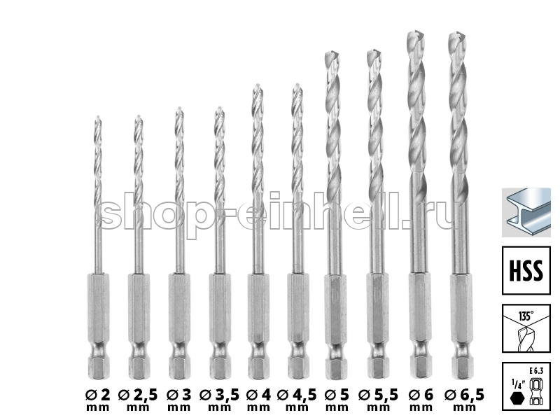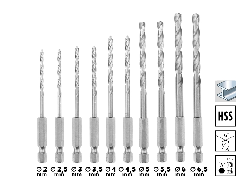 Каждое сверло по металлу имеет хвостовик E 6.3 и наконечник с раздвоенным острием под углом 135°.